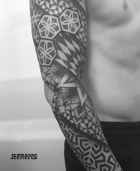 Get ready to be enchanted by the mesmerizing allure of the dotwork style in geometric tattoos. Each dot seamlessly weaves into intricate patterns and shapes, unveiling a detailed and mesmerizing design that distinguishes your tattoo from the rest, eliciting admiration from all who lay eyes upon it. This visual masterpiece goes beyond mere ink, leaving an indelible mark on both hearts and minds, forever etching its brilliance in memory.